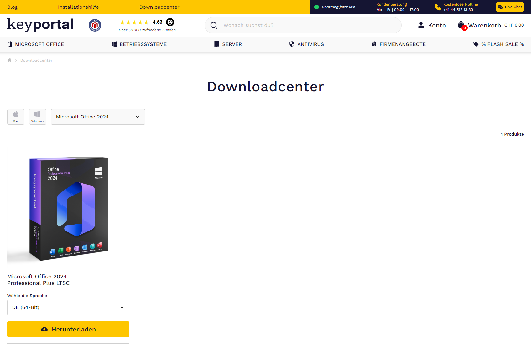 2. Lade unser Produkt herunter indem du die passende Sprache & Version auswählst und dann auf «Herunterladen» klickst.