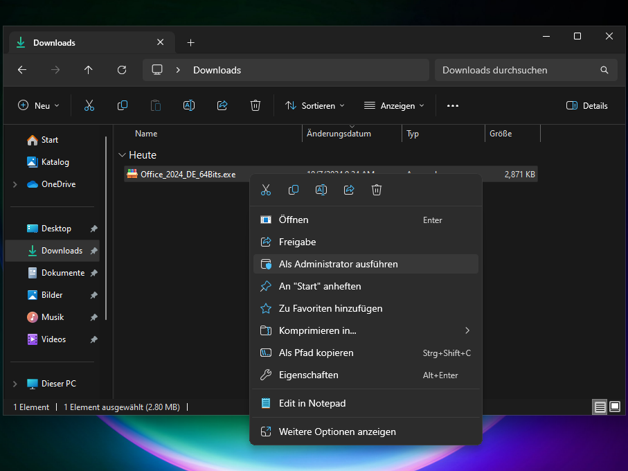 3. Führe die heruntergeladene Datei als Administrator aus, indem du mit der rechten Maustaste auf die .exe-Datei von uns klickst und mit der linken Maustaste auf «Als Administrator ausführen» klickst. Hinweis: Sollte dort die Option nicht aufgeführt sein, musst du die Datei erst mit einem einzelnen Linksklick auswählen und anschließend einen Rechtsklick darauf machen.